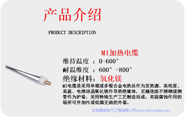 MI電纜是采用 單根或多根合金電熱絲作為發(fā)熱源、高純度、高溫、電熔結(jié)晶氧化鎂作導(dǎo)熱絕緣體,無縫連續(xù)不銹鋼或銅管作為護(hù)套,采用特殊生產(chǎn)工藝制造而成。有強(qiáng)腐蝕作用的場所可外加PE或低煙無鹵的外套。