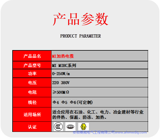 銅護(hù)套系列礦物絕緣加熱電纜可以滿足高溫條件和長輸管線伴熱的需要。銅護(hù)套加熱電纜的***高承受溫度可達(dá)250℃,導(dǎo)體電阻值的范圍從480-0.5Ω/km,對要求防腐或埋地應(yīng)用的場合,需加高密度聚乙烯HDPE外護(hù)套(MI),MI***高承受溫度可達(dá)90℃,礦物絕緣電纜具有優(yōu)良的機(jī)械強(qiáng)度。